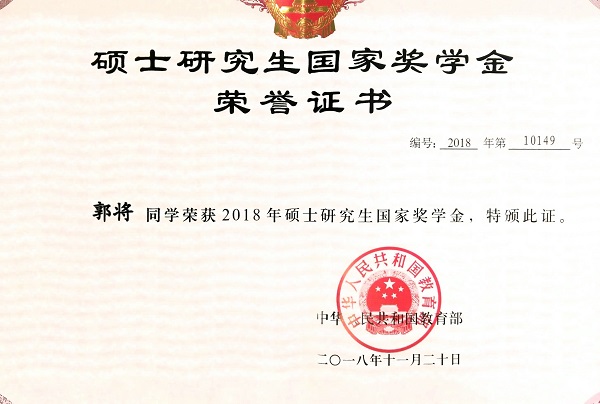 郭将,潘元欣获2018年硕士研究生国家奖学金